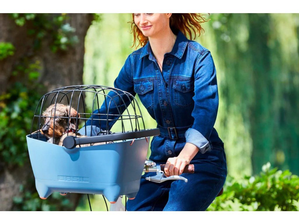 Vorderer Kunststoffkorb für Hunde am Fahrrad.
